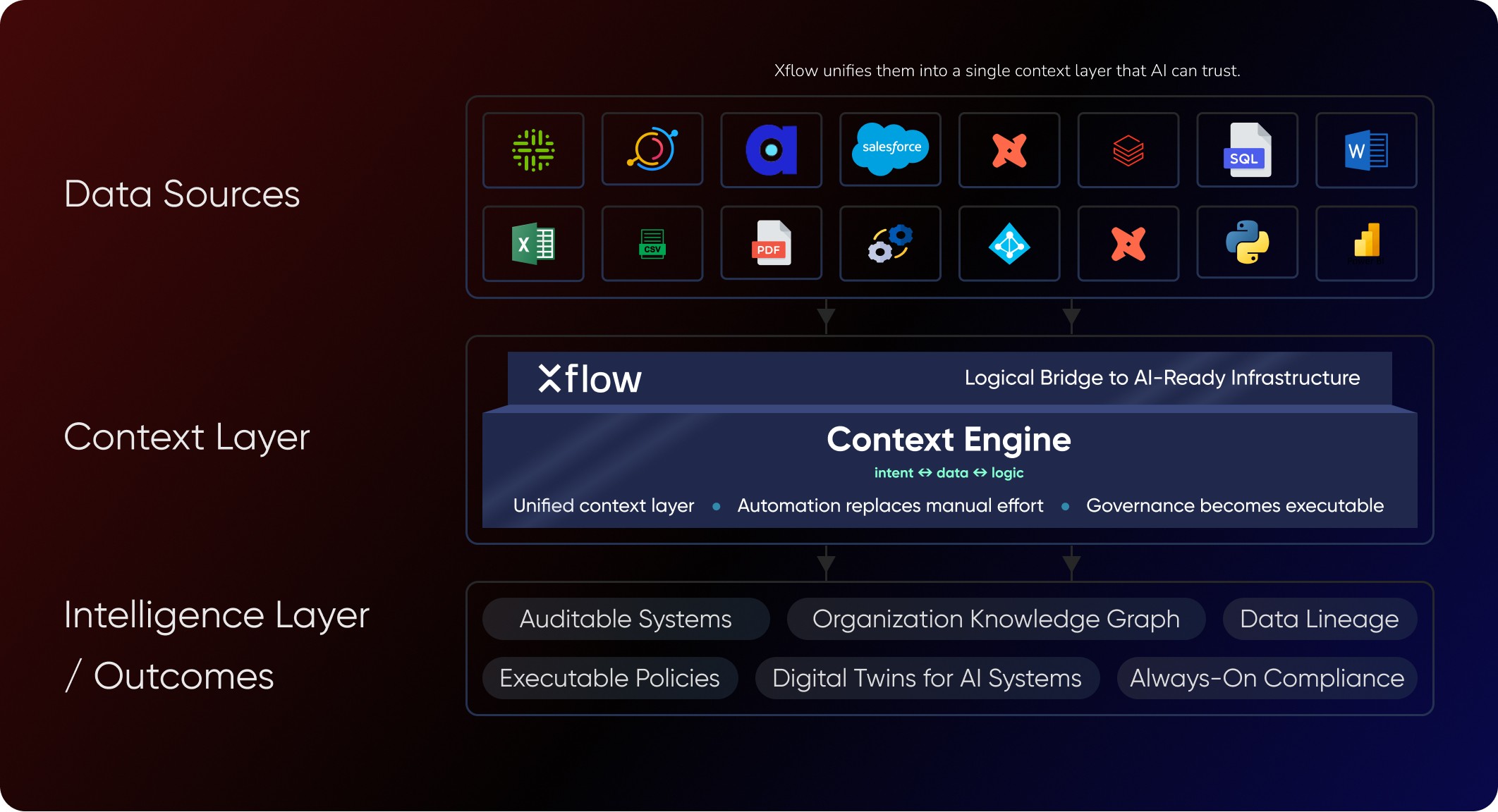 xflow transforms fragmented metadata into governed, machine-readable context — so AI systems can reason, act, and stay compliant by design.